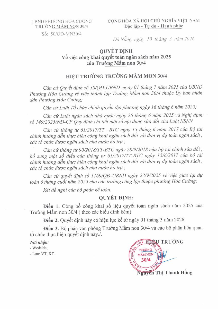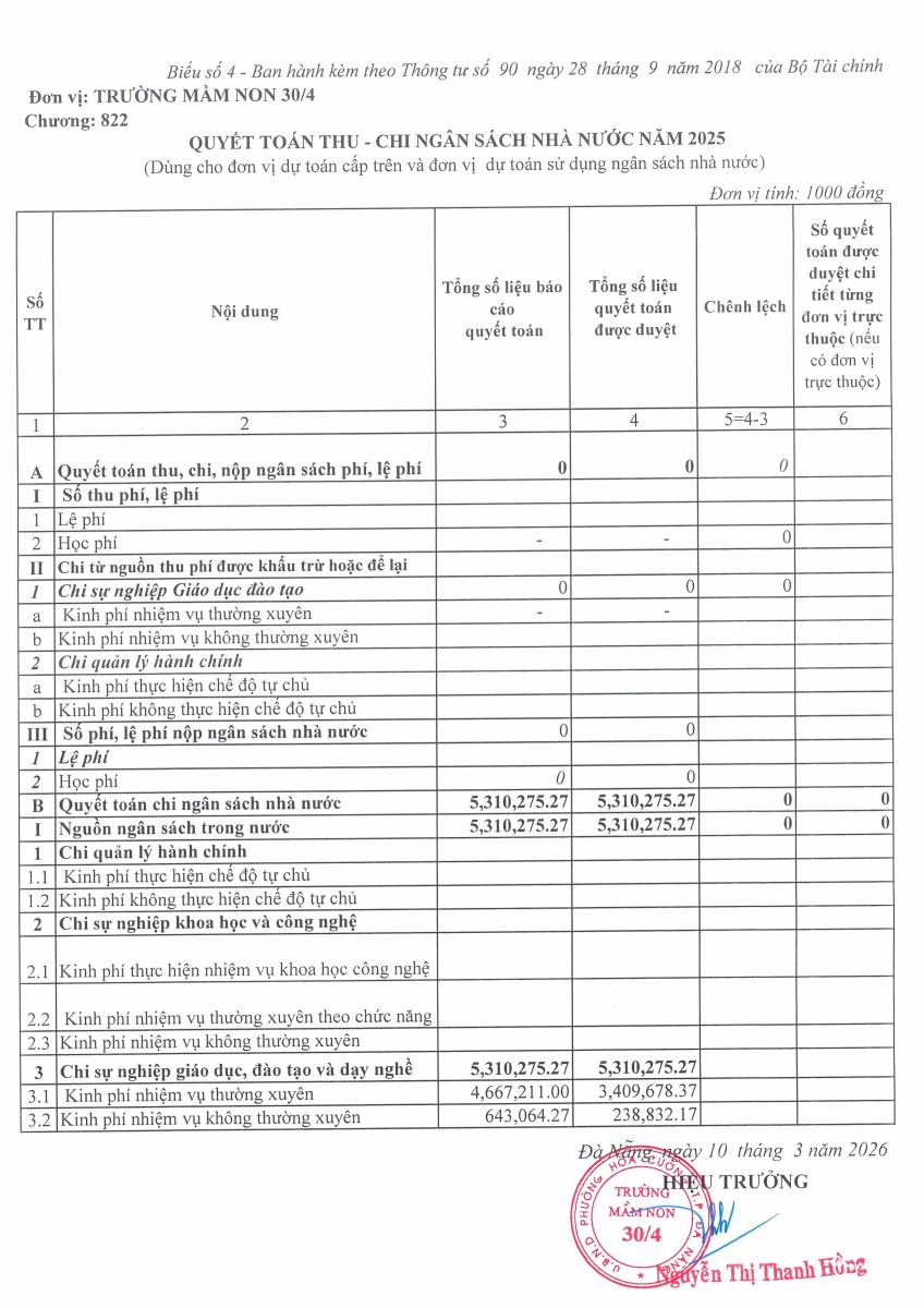 CÔNG KHAI QUYẾT TOÁN NGÂN SÁCH NĂM 2025 CỦA TRƯỜNG MẦM NON 30/4